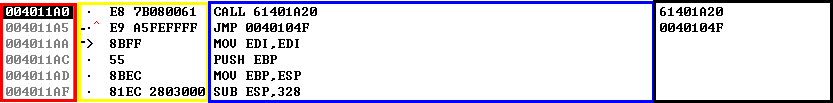| Preview CALL/JMP address | [Enter] | 커서가 CALL / JMP 등의 명령어에 위치해 있다면, 해당 주소를 따라가서 보여줌 (실행되는 것이 아니며, 간단히 함수 내용 확인 시에 유용) |