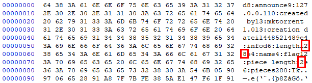 HxD로 해당 토렌트 파일을 확인해보면 공유 파일 크기는 28Byte이고, piece 조각 크기는 2Byte라는 것을 확인 가능하다.