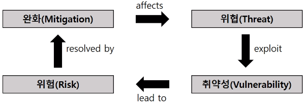 자산(asset) 내에 존재하는 취약성(vulnerability)을 위협(threat)으로 발생하는 실질적 손해와 그 가능성을 위험(risk)이라고 함