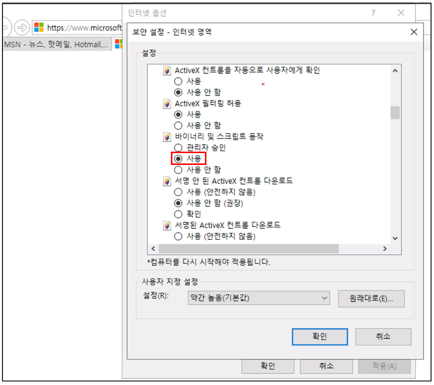 Internet Explorer 브라우저의 보안 컨텍스트 외부에서 실행 (브라우저 보안 설정 무시)